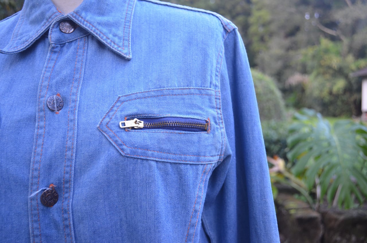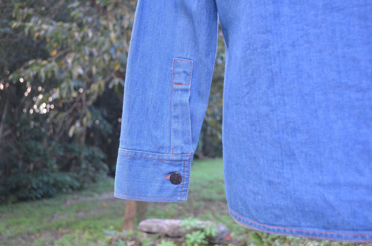 ライトオンスの淡いブルーデニムにオレンジのステッチ