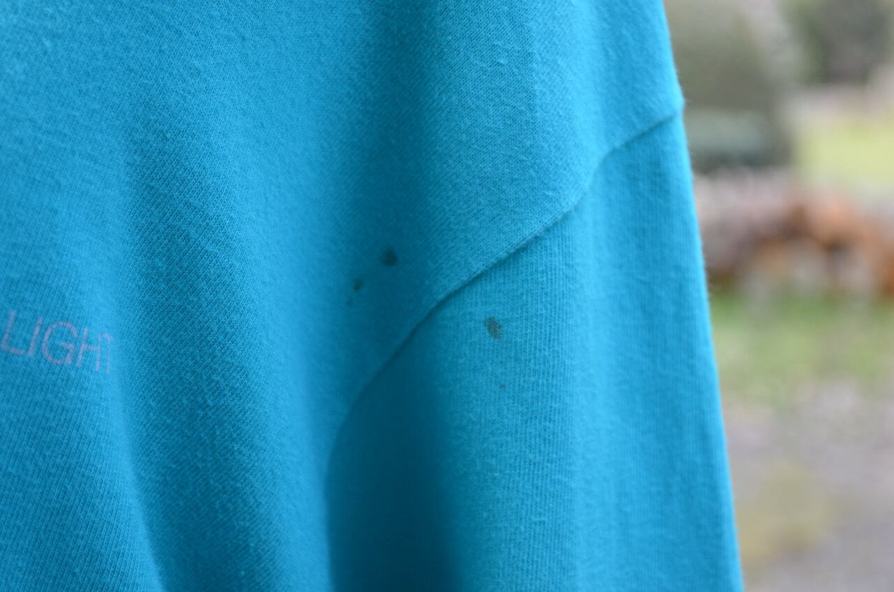 フロント左袖付け根付近とバック左肩付近に汚れあります